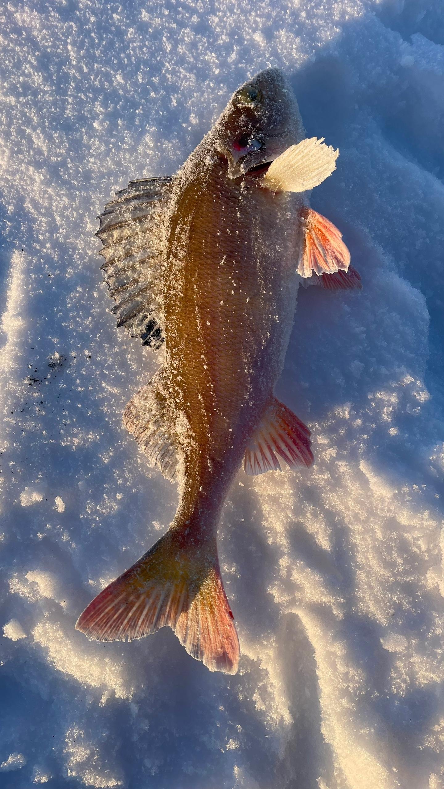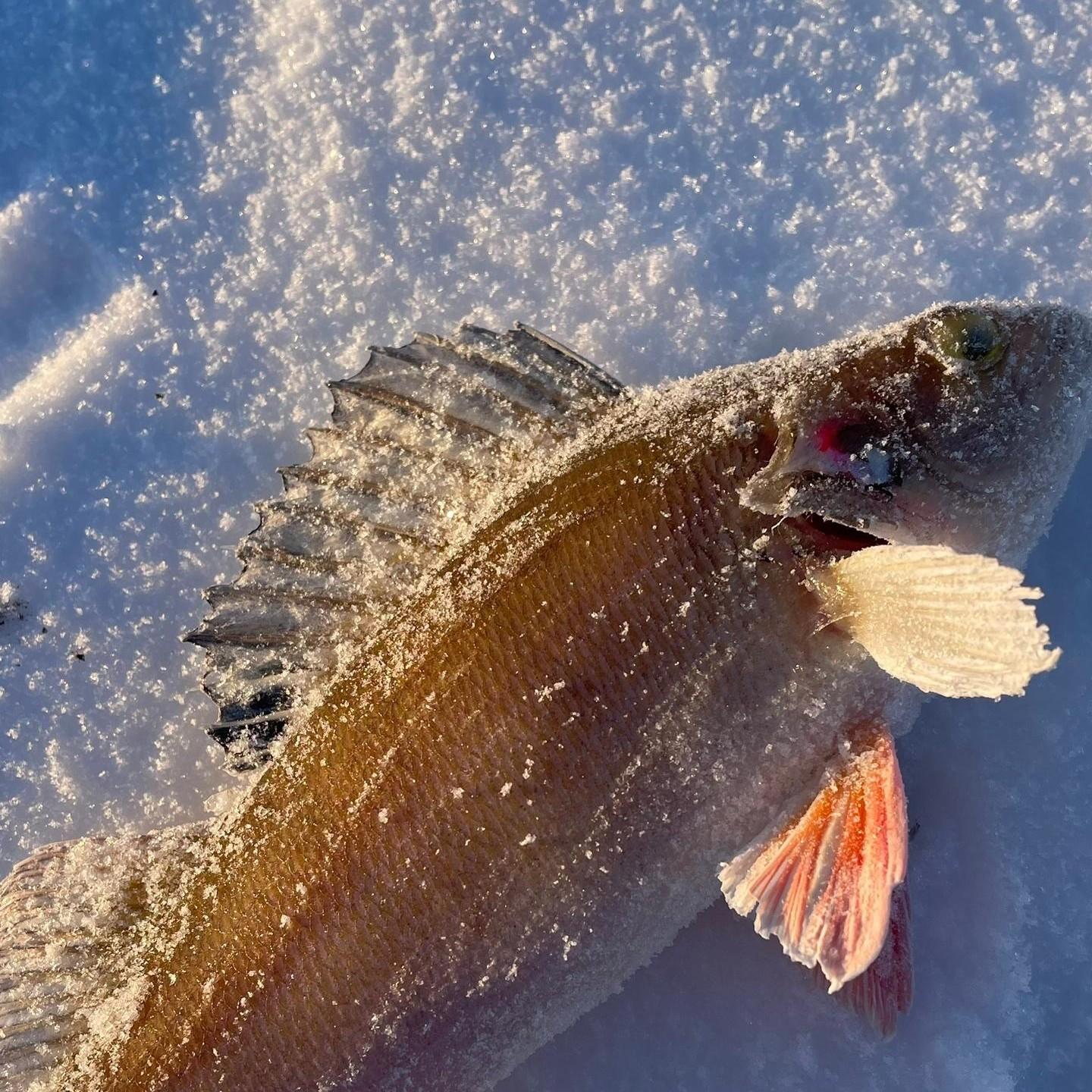 «Первый взмах балансира — и тут же поклёвка. Смещаюсь чуть в сторону, примерно по одному горизонту глубины, и ловлю интересного окуня. Никогда такого не видел. Конечно, особо устроить фотосессию данному экземпляру не получилось, телефон мгновенно покрывается инеем, и руки молят о тепле. Но все же удалось половить полосатого, пока совсем не окоченел», — поделился Анатолий.