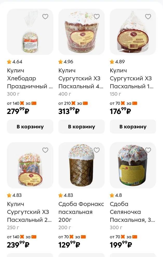 Сетевые супермаркеты «Пятерочка», «Магнит» и «Перекресток» выставили на продажу классические куличи с изюмом, цукатами или без добавок. Цены на них начинаются от 99 рублей и доходят до 394 рублей. Большинство изделий имеют длительный срок хранения — около месяца, поэтому их привозят из разных регионов России. Однако в ассортименте есть и продукция местных производителей, например, сургутского хлебозавода по цене 313 рублей.