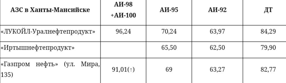 - В Ханты-Мансийске: на АЗС «Газпром нефть» подорожали марки АИ-98 и АИ-100 до 91,01 рубля. Бензин АИ-92 стоит от 62,52 до 63,97 рублей, АИ-95 — от 65,5 до 70,24 рублей, дизель — от 79,9 до 84,29 рублей.