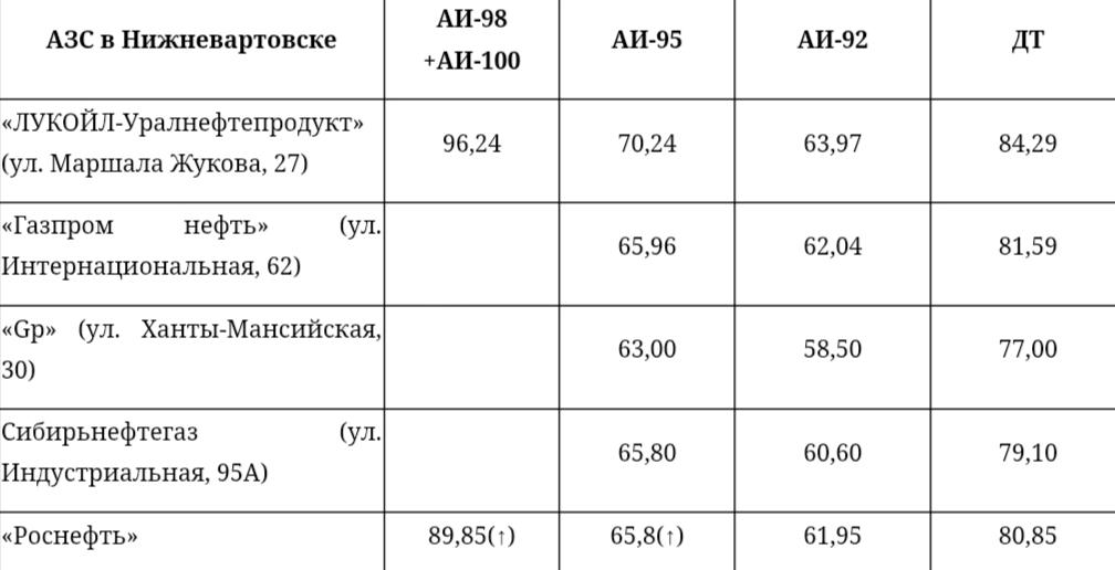 - В Нижневартовске: АИ-92 — от 58,5 до 63,97 рублей, АИ-95 — от 63 до 70,24 рублей, дизель — от 77 до 84,29 рублей.