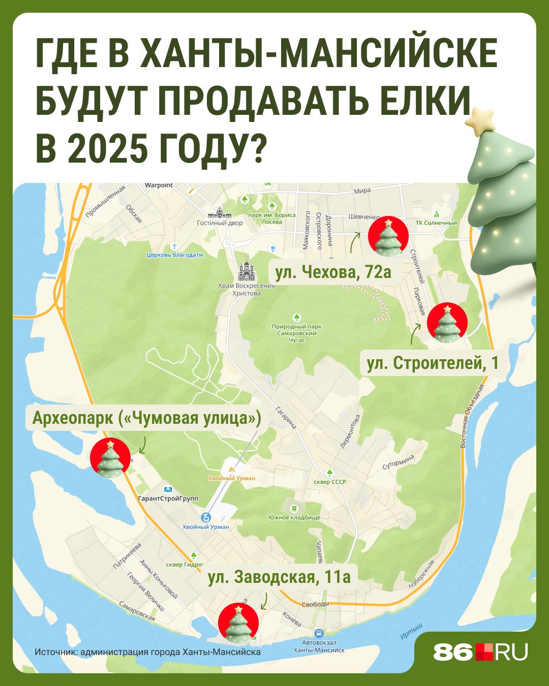 Торговля новогодними ёлками в Ханты-Мансийске началась и продлится до конца декабря. Администрация города утвердила места для размещения елочных базаров, информацию о которых 86.RU оформил в инфографике.