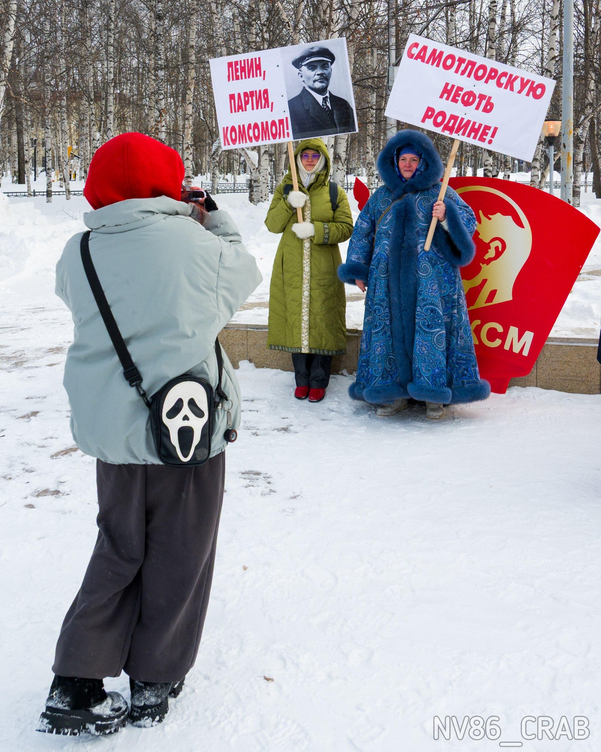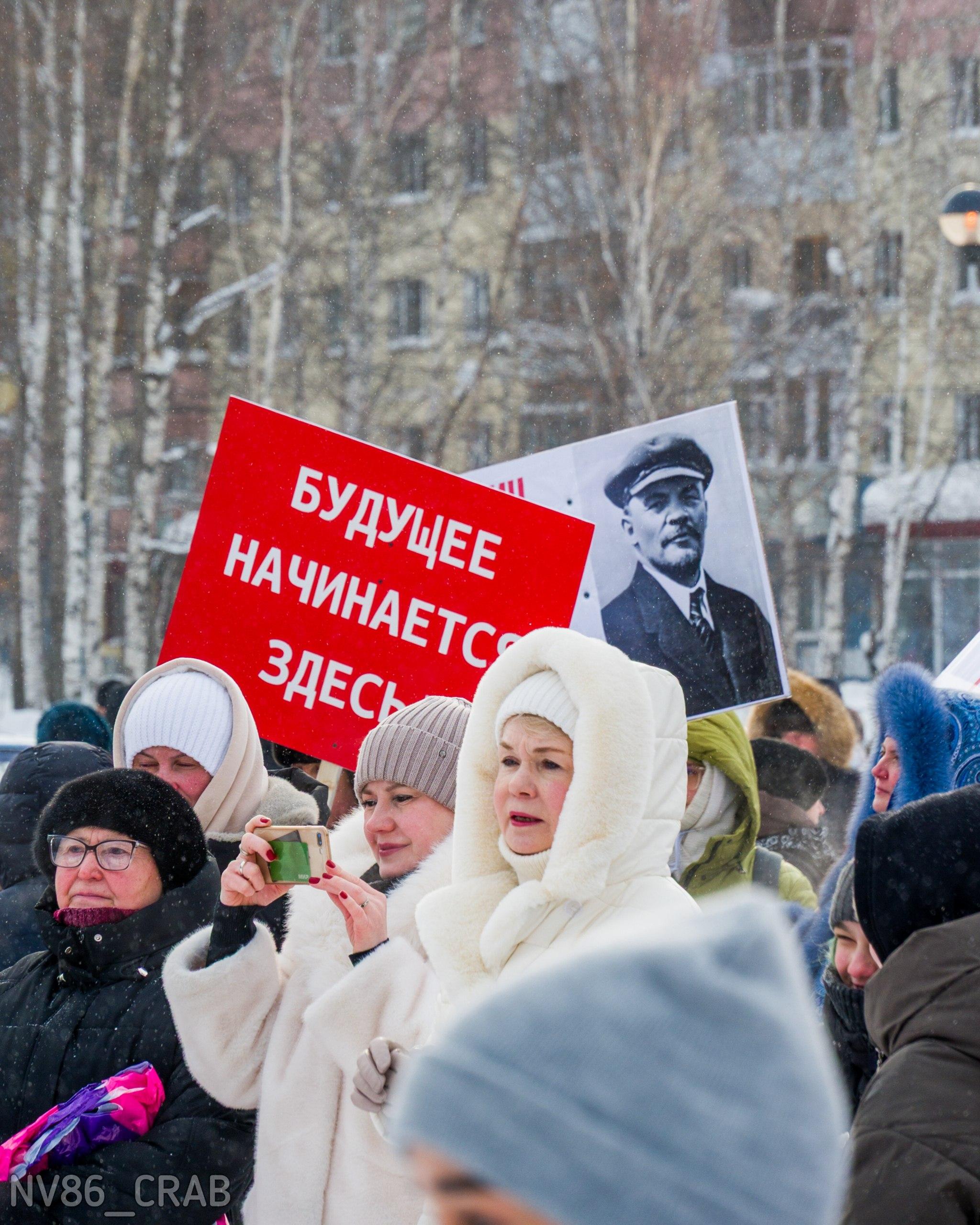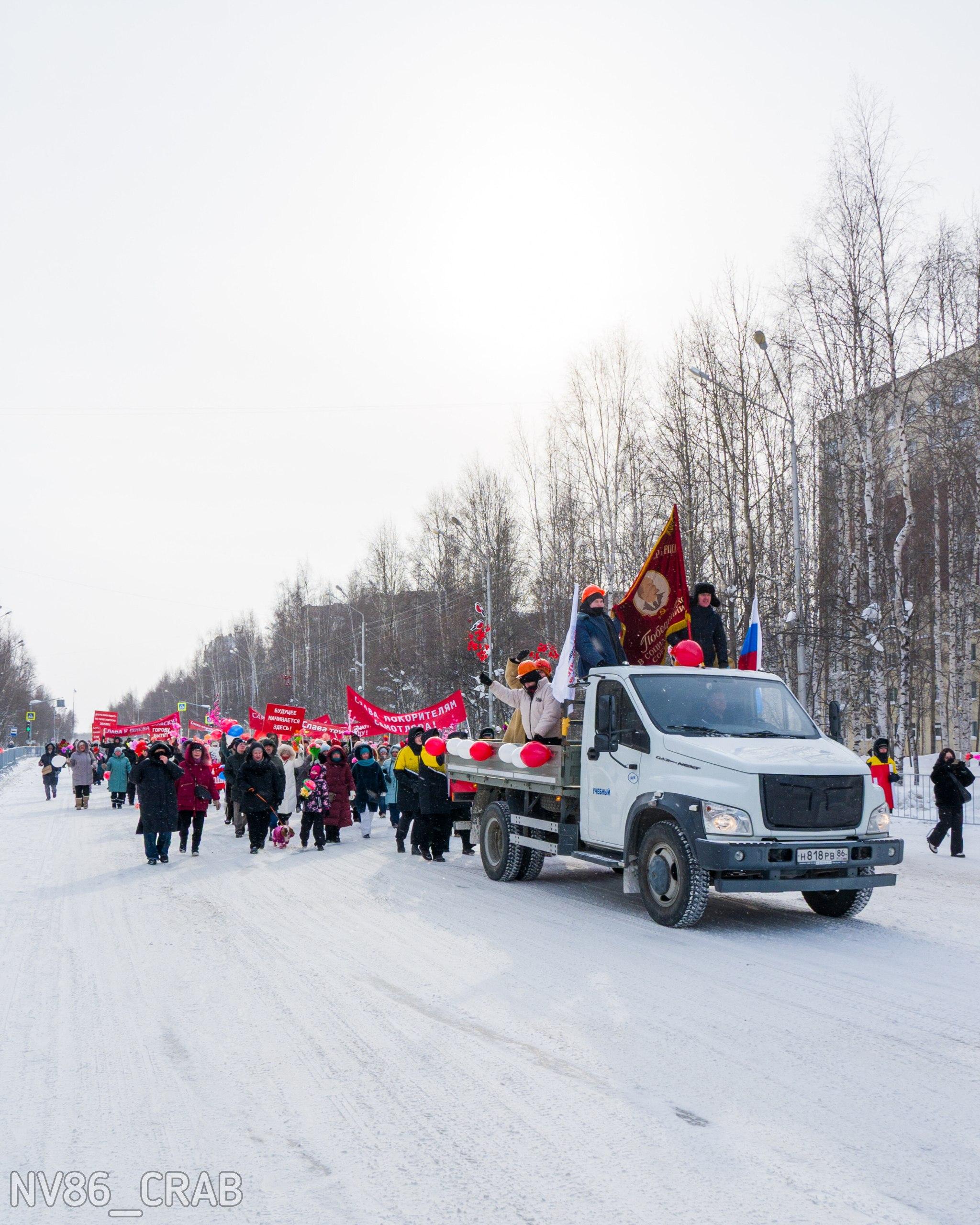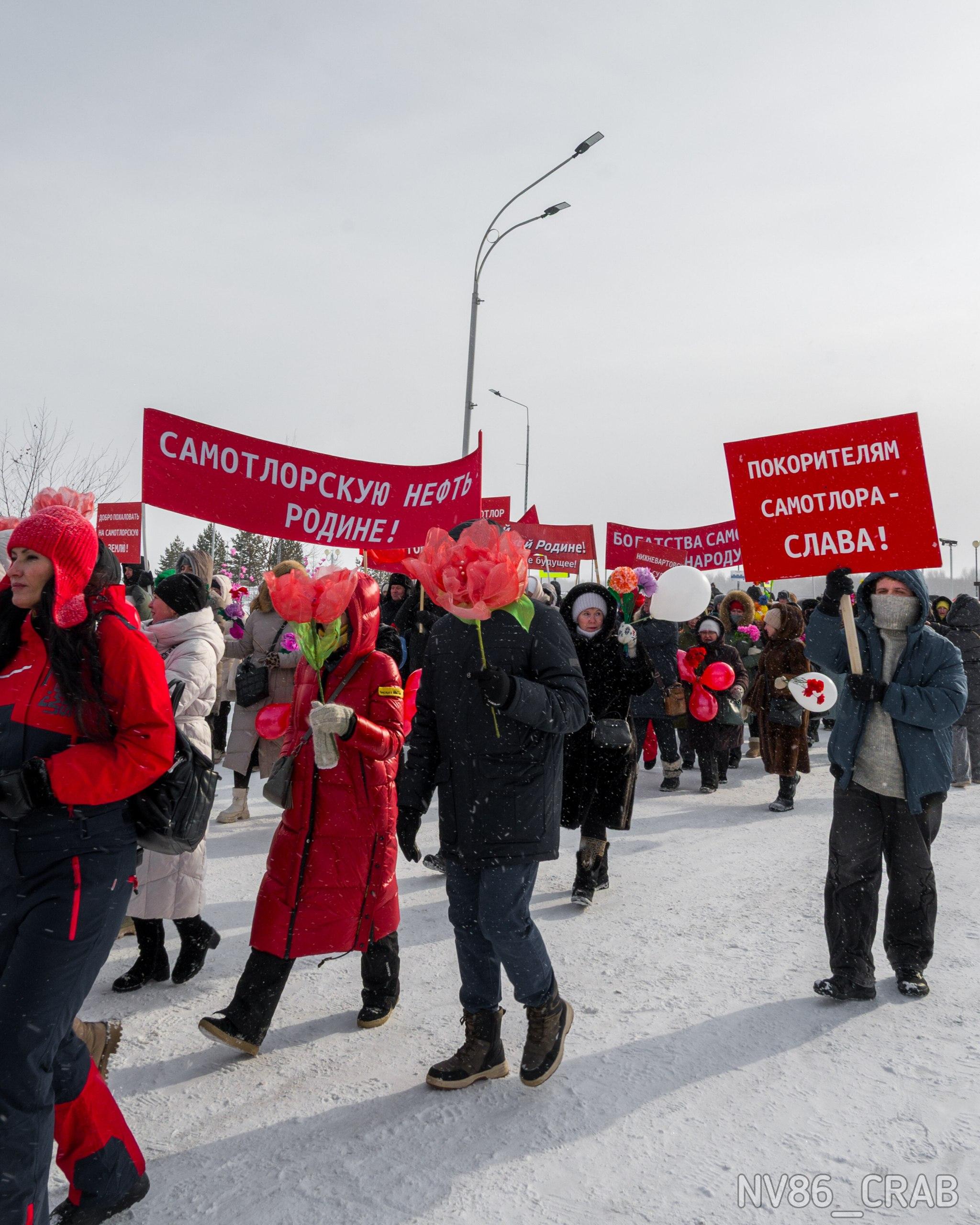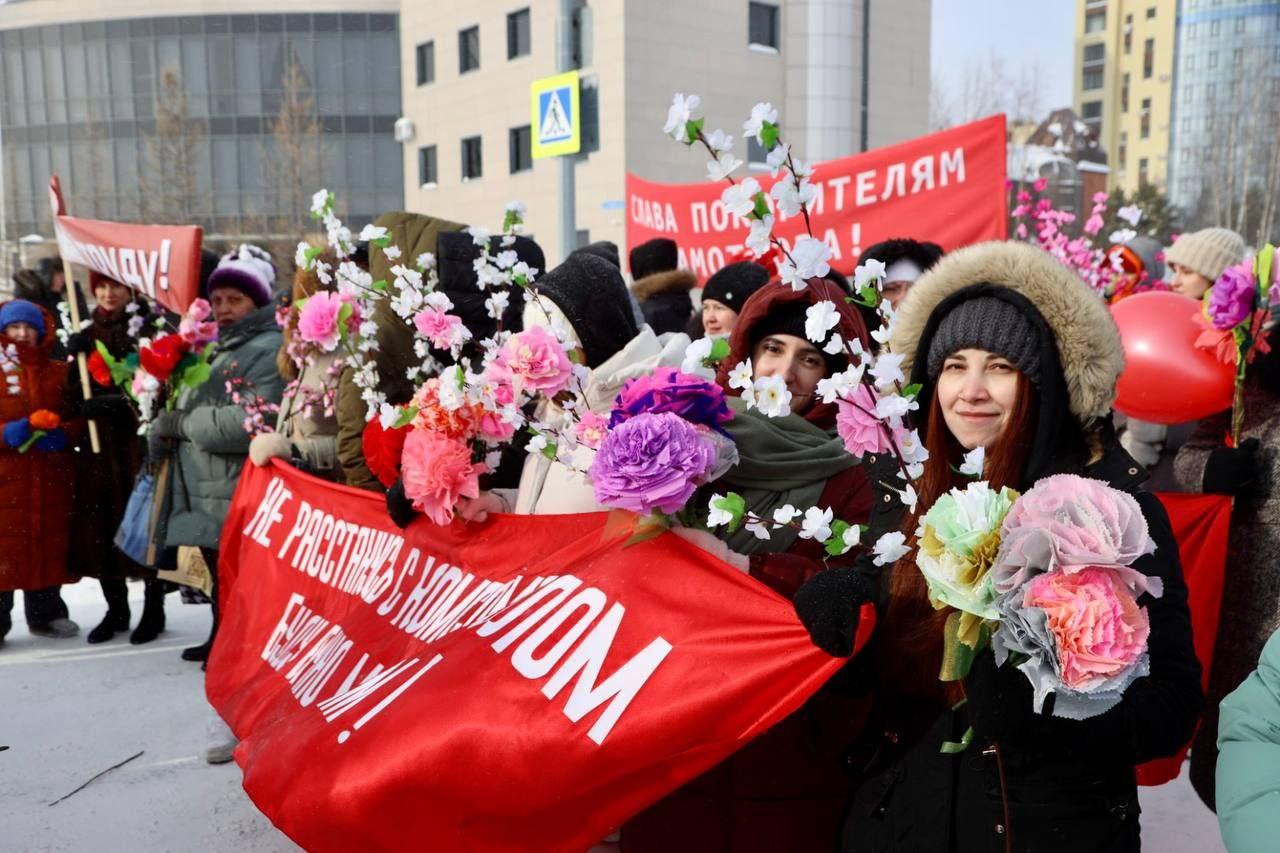Жители Нижневартовска вышли на массовое шествие с красными плакатами и цветами, воссоздавая атмосферу советских времен.