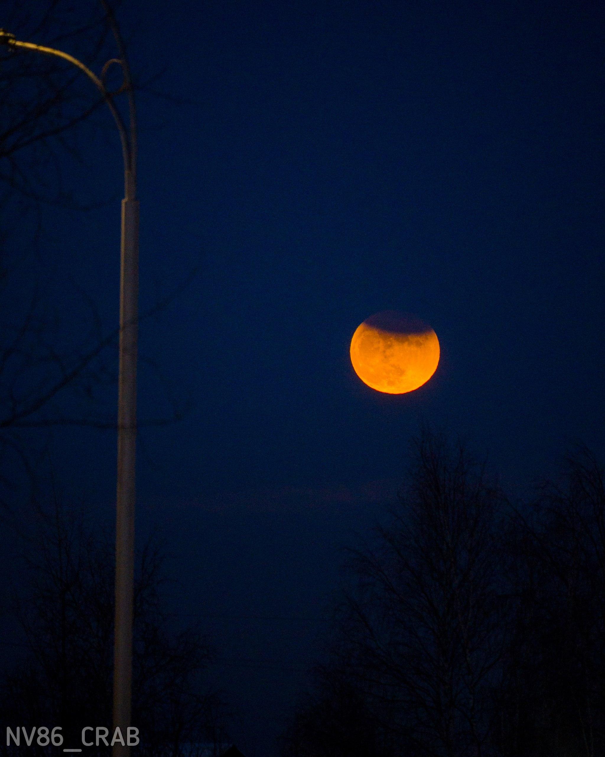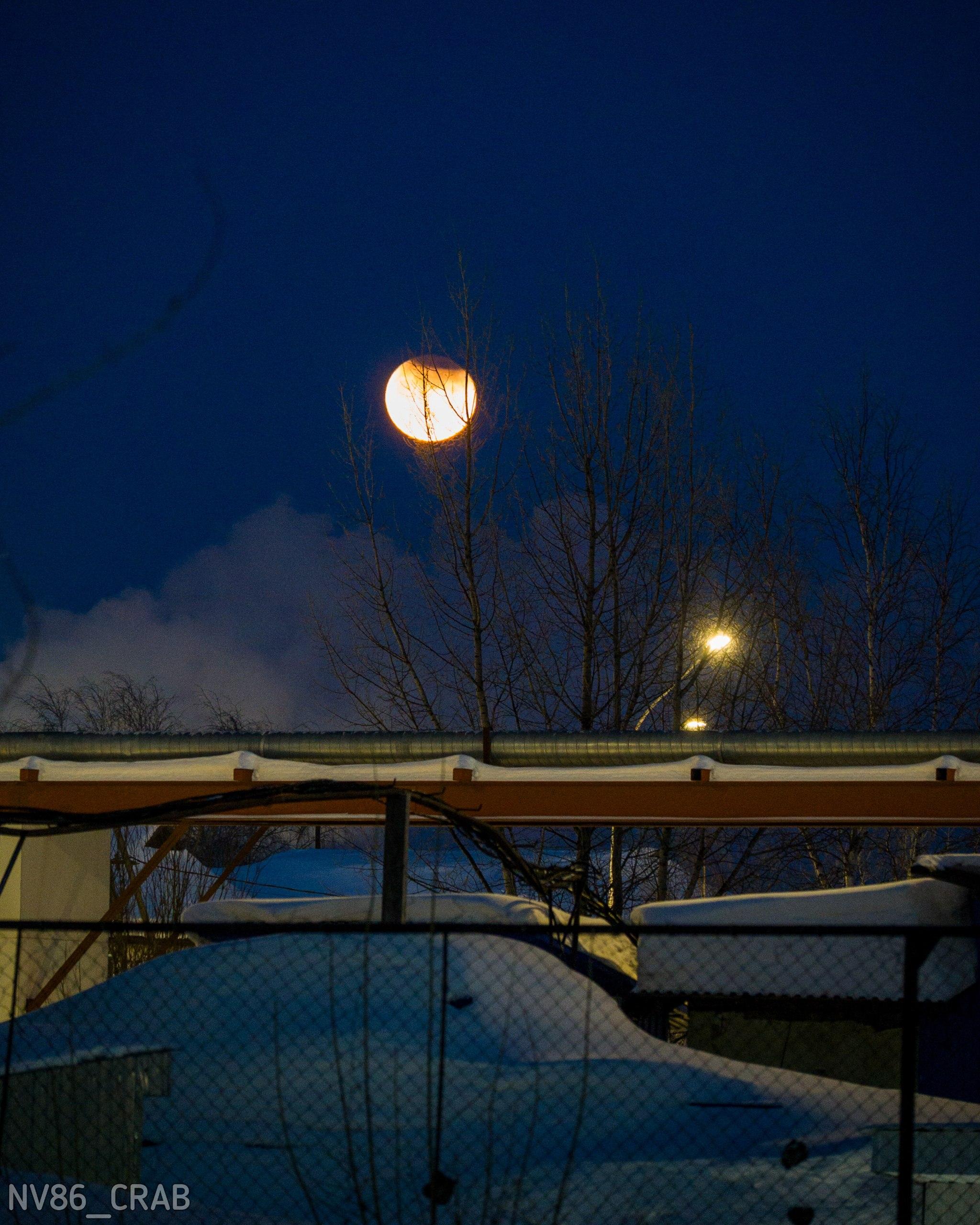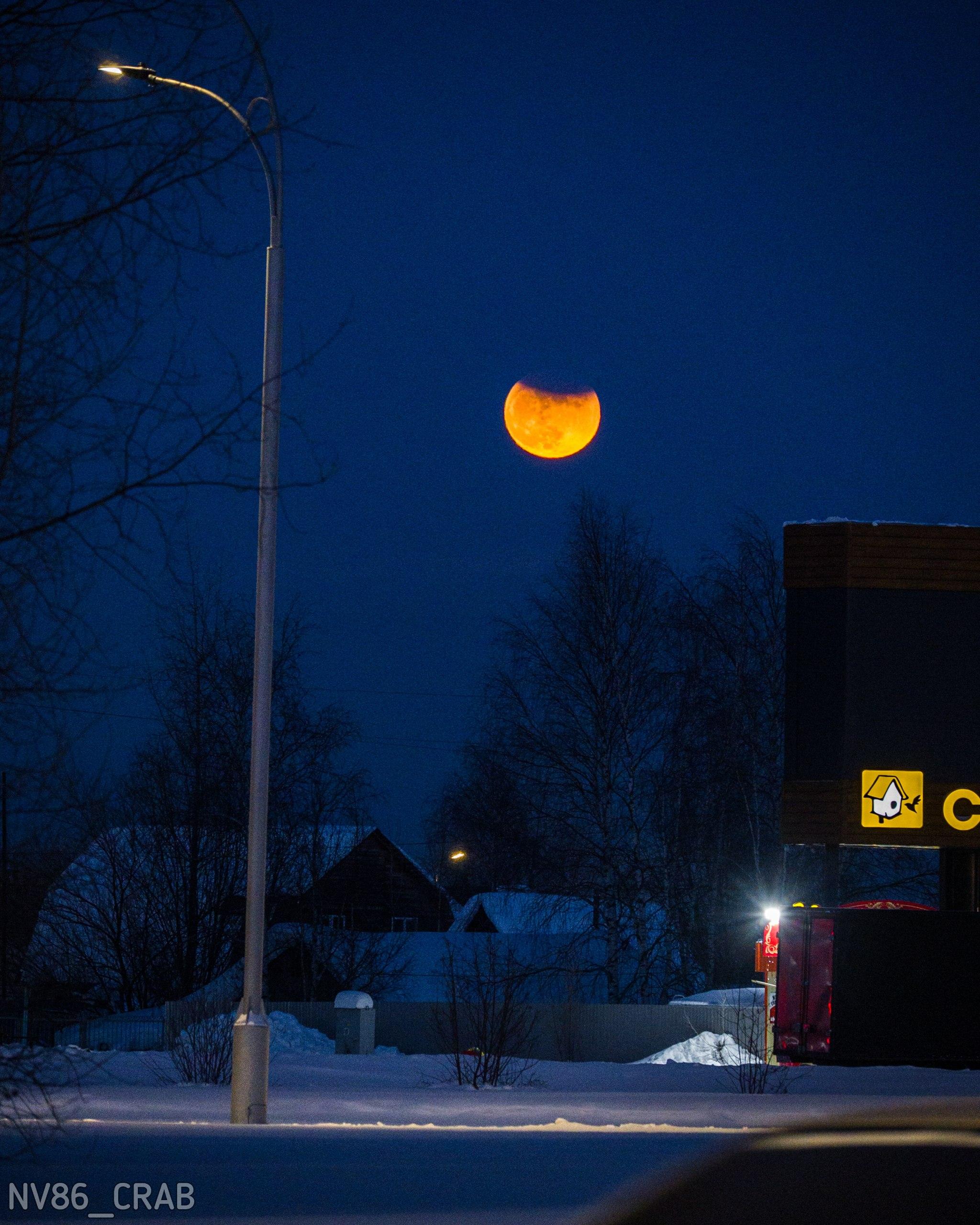 Местные жители успели сделать фотографии, хотя условия для съёмки были ограничены. «Луна в пригодном для съемки виде пробыла всего примерно 20 минут», — отмечает паблик «Типичный краб Нижневартовск».