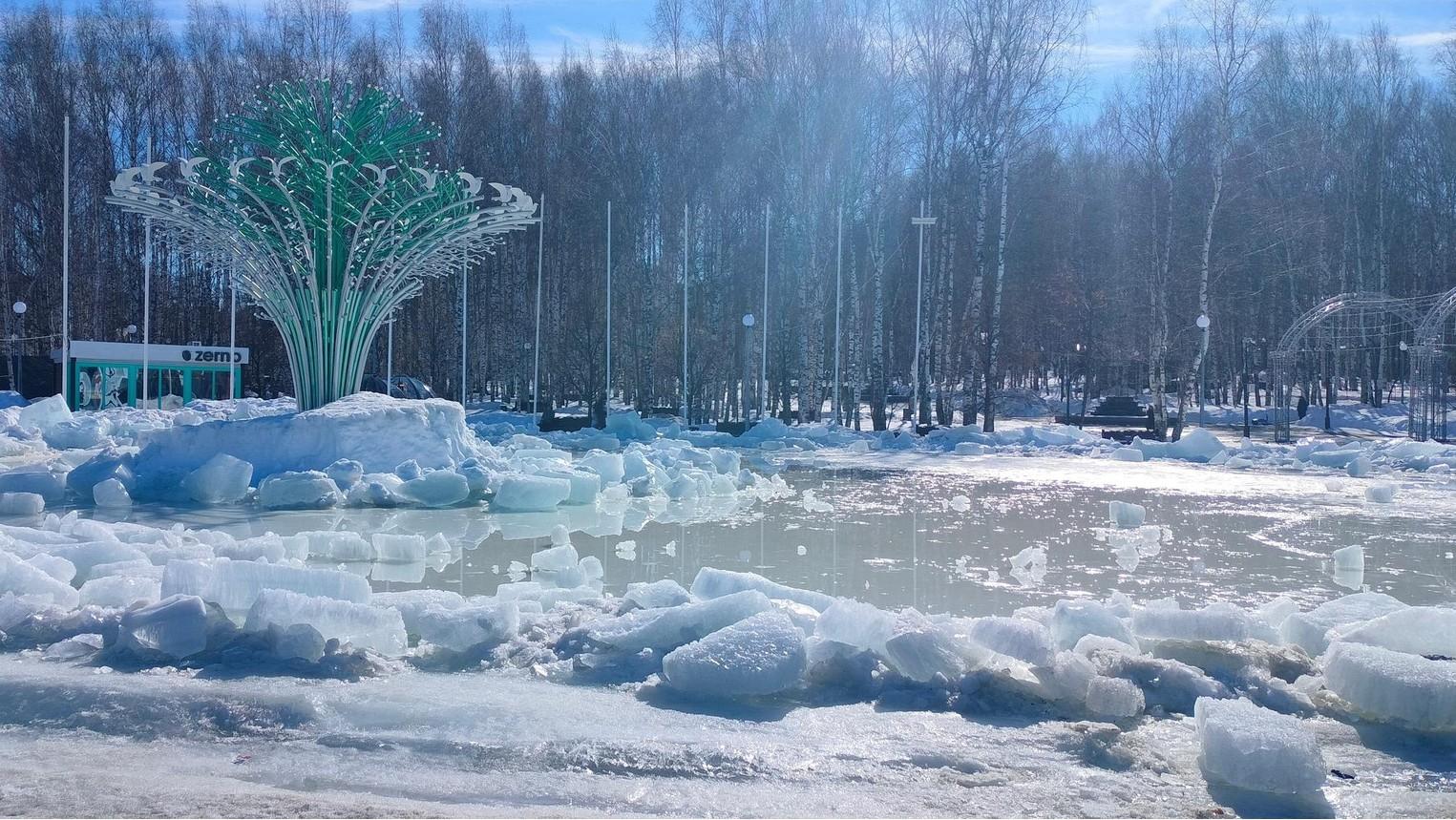 В Ханты-Мансийске из-за потепления растаял один из городских катков, и его территория теперь представляет собой большую лужу. Власти пока не приступили к уборке.