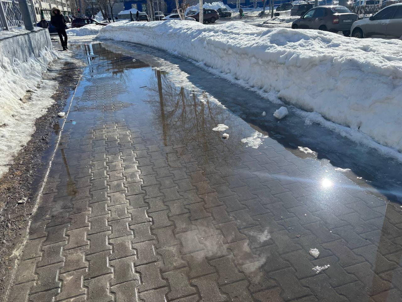 Проблема с талыми водами затрагивает и Сургут, где многие тротуары также оказались затопленными.