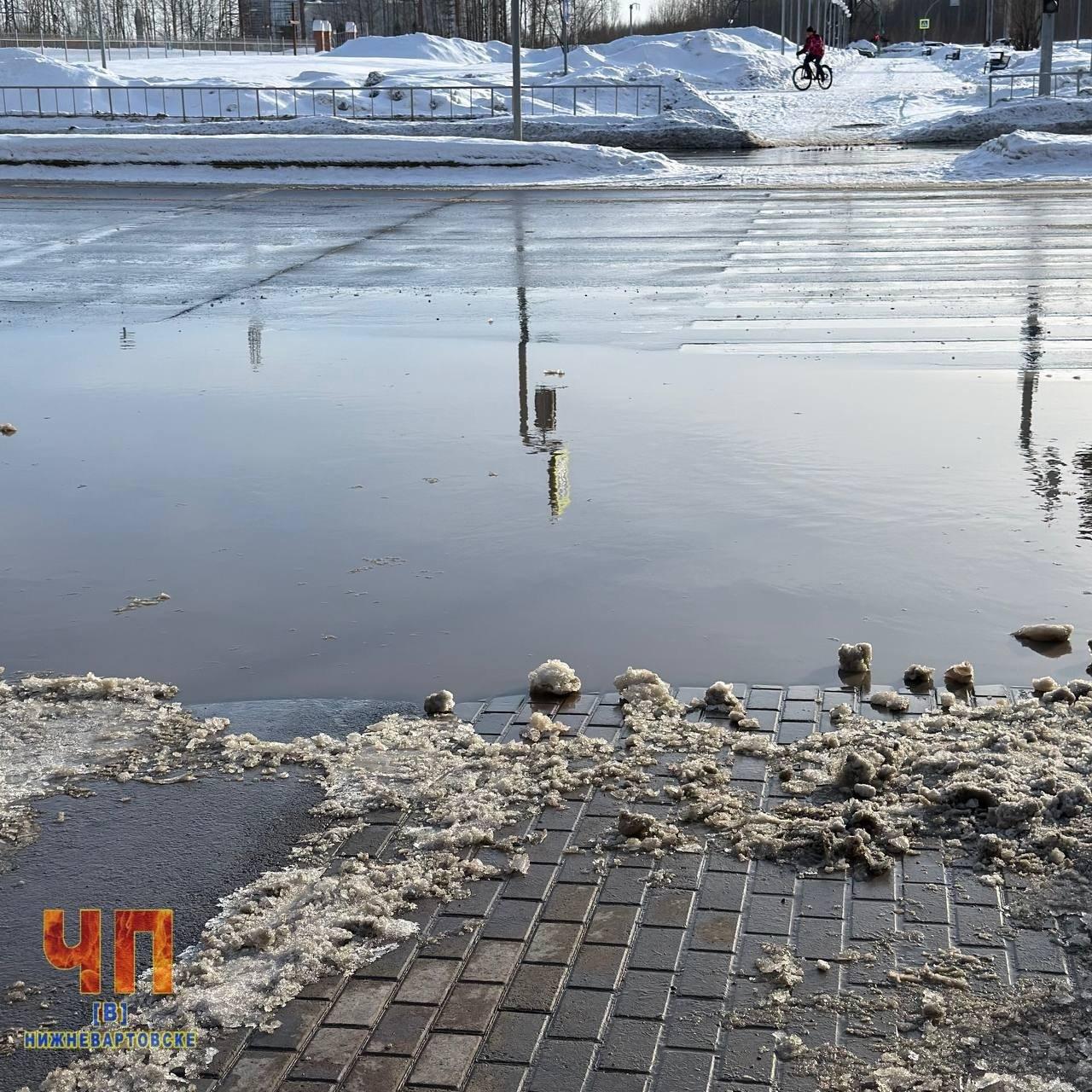 Стремительное наступление весны в Югре приводит к массовому таянию снега. Образующиеся огромные лужи создают серьезные препятствия для пешеходов и транспорта, о чем активно сообщают жители в социальных сетях.
