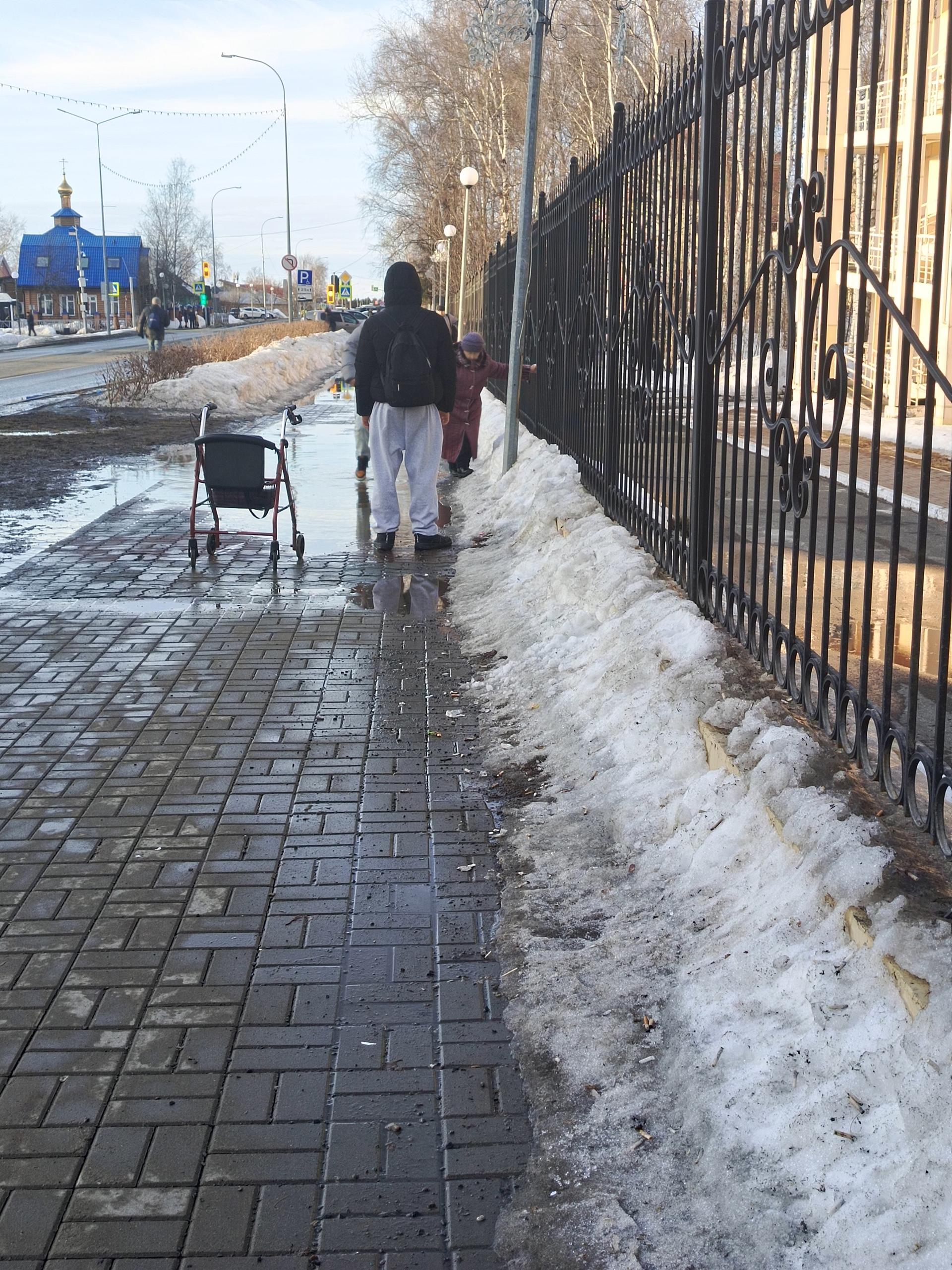 В Ханты-Мансийске одна из проблемных зон — тротуар возле Окружной клинической больницы. «Хочу обратить внимание на лужу возле ОКБ, — пишет жительница окружной столицы в телеграм-канале «Типичный Ханты-Мансийск». — На этом участке тротуара — она каждый год. Вчера шла бабушка с ходунками, пройти ей было нереально по этому озеру. Спасибо двум парнишкам, что шли мимо — и не прошли. Так вот у меня вопрос, неужели нельзя положить на это место поддоны, или загнать маленький тракторёнок, чтобы он ковшом эту воду согнал оттуда? Ведь это больница! Вчера бабушка с ходунками, завтра женщина с коляской после кесарева, сегодня дедушка с костылями и так далее. Весна только начала вступать в свои права, лужи огромные уже, а снега много ещё!»