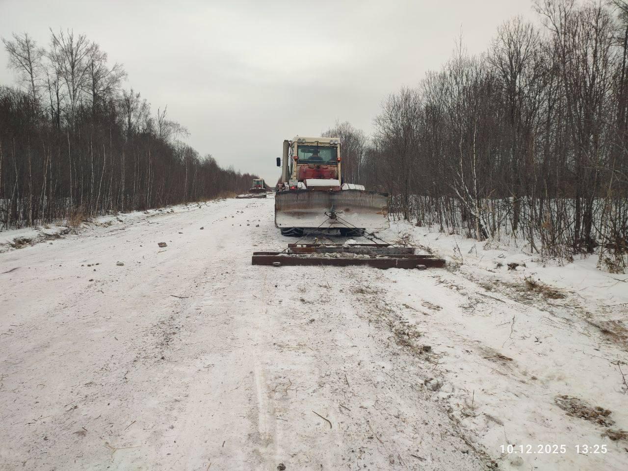 Работы на трассе ведутся в активном режиме. Для обеспечения комфорта и безопасности движения экскаваторы и бульдозеры устраняют колейность и выравнивают грунтовое полотно. Ровную и надёжную поверхность дороги формируют тракторы и автогрейдеры.