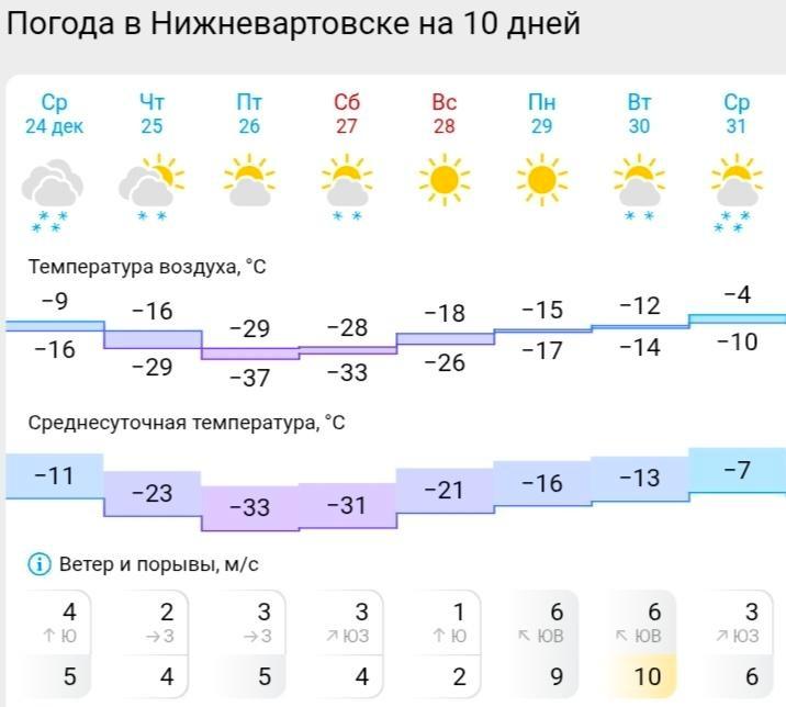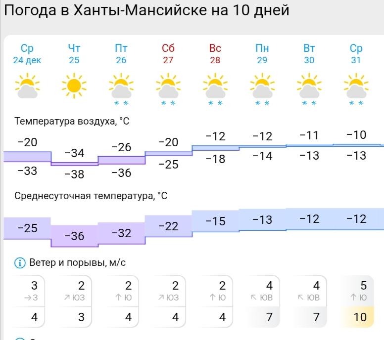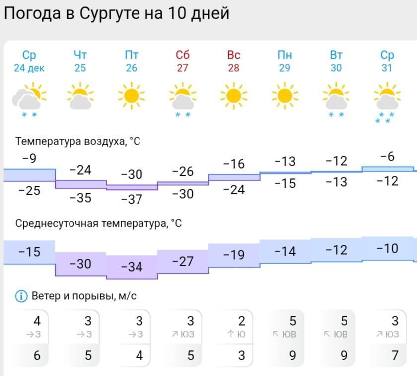 По данным Gismeteo, до субботы в Сургуте, Нижневартовске и Ханты-Мансийске сохранятся морозы до -38 градусов и временами небольшой снег. В воскресенье в Ханты-Мансийске термометр покажет -12…-18 градусов, а в Сургуте и Нижневартовске будет холоднее — до -24…-26 градусов. По-настоящему теплее станет на следующей неделе, перед Новым годом.